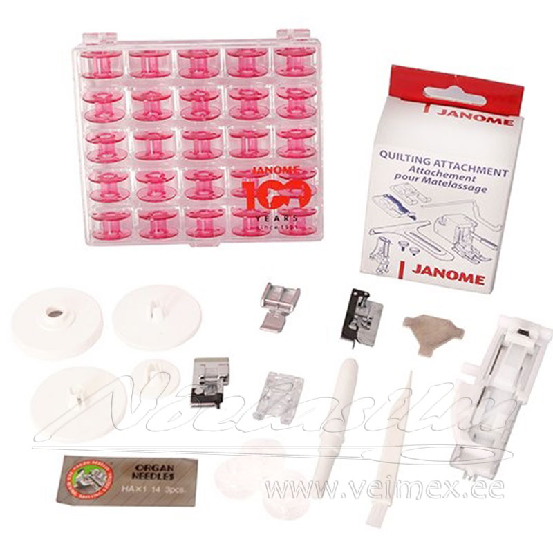 Kaasasolev varustus – 4 x pool, nõelad x 3, siksak tald A, läbipaistev tald, läbipaistev tald aplikatsioonide õmblemiseks F, lukuõmblustald E, peitepiste tald G, ääristustald C, kanga ääre (6 mm) otseõmblustald O, nööpaugu tald R, harutaja, puhastuspintsel, niidirulli lisahoidik, kruvikeeraja, suur abitöölaud (280 x 410 mm.)